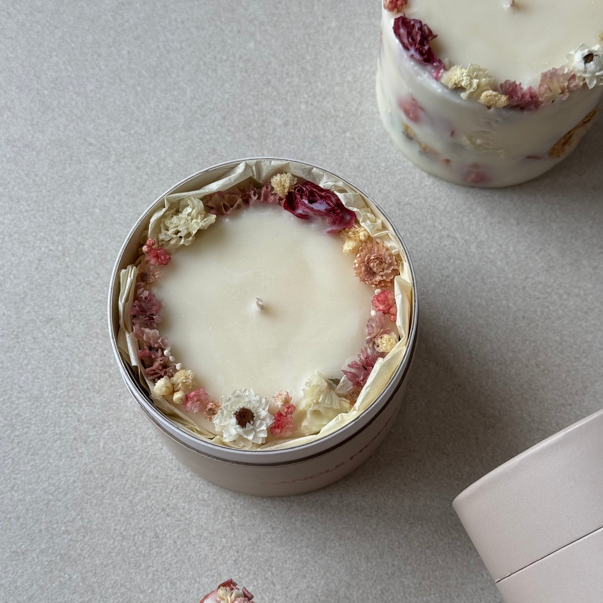 A soft pink botanical candle handcrafted with dried flowers and essential oils. Elegant and calming, it brings a touch of natural beauty and warmth to any space.